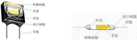 結(jié)構(gòu):溫度保險絲結(jié)構(gòu)分為方殼型和瓷管型兩種,其工作原理是相同的。 如圖所示,溫度保險絲結(jié)構(gòu)包括感溫合金,它連接在兩引腳上,表面包覆特殊樹脂,插入到陶瓷管或塑料外殼內(nèi),再用環(huán)氧樹脂封裝。