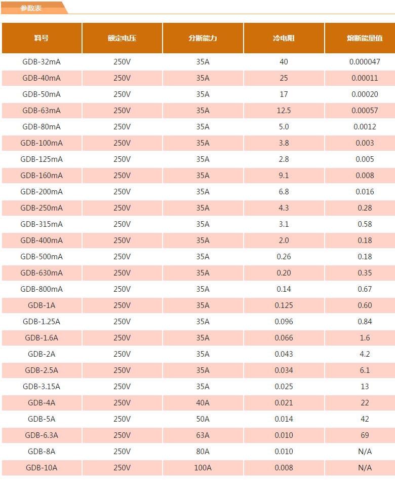 產(chǎn)品型號:GDB-8A,GDB-80mA,GDB-800mA,GDB-63mA,GDB-630mA,GDB-6.3A,GDB-5A,GDB-50mA,GDB-500mA,GDB-4A,GDB-40mA,GDB-400mA,GDB-32mA,GDB-315mA,GDB-3.15A,GDB-2A,GDB-250mA,GDB-200mA,GDB-2.5A,GDB-1A,GDB-160mA,GDB-125mA,GDB-10A,