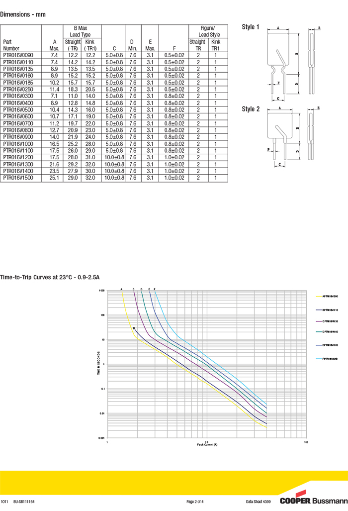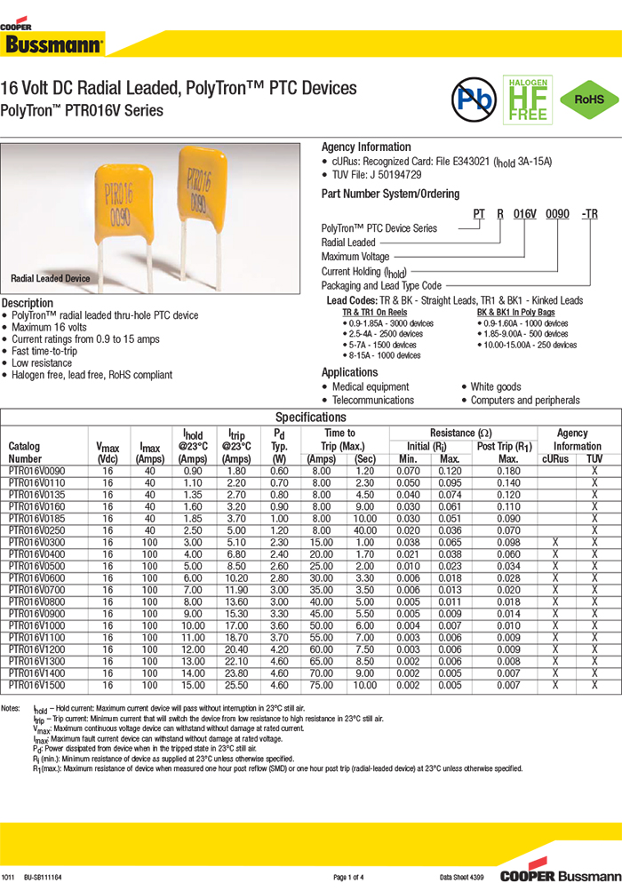 bussmann PTR016V系列 自恢復插件保險絲 黃色可恢復